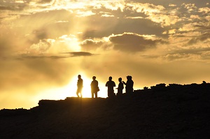 Tramonto nella valle della Luna, con serata molto nuvolosa dal lato delle montagne: i vulcani sono tutti coperti di nuvoloni neri, e ci facciamo di Pinot nero cileno per aperitivo!