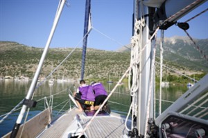 Nisos Thilia. Bagni sole e pranzo. Notte trascorsa a Vathi Itaca vento 5-6 Beaufort tutta la notte. Due ancore. Tenuta ottima. Tutto ok.