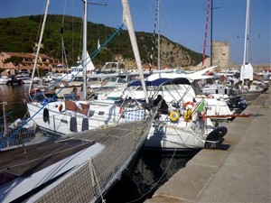 Siamo arrivati a Capraia porto. Ci ha accolto un ormeggiatore su gommone molto efficiente che ci ha fatto ormeggiare a una delle boe poste nell’avamporto. Il posto è da favola. Siamo fissati di prua alla boa e a poppa con delle trappe su corpi morti. Tutte le barche sono disposte parallelamente forse un po’ troppo vicine. Siamo arrivati circa alle 15:00 e c’era poco movimento, poi sono arrivati in massa e il nostro povero ormeggiatore ha avuto il suo gran da fare.